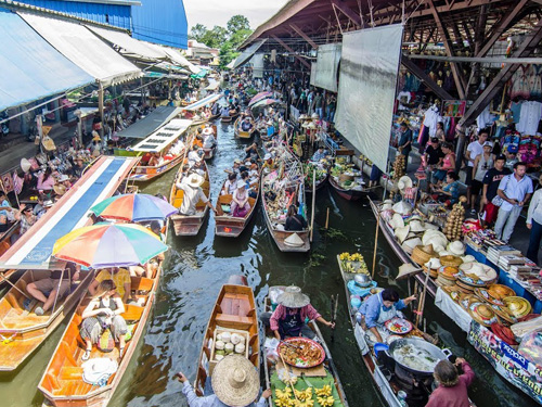 早餐后,您将会前往下一个值得去的旅游路线-丹嫩莎杜艾水上市场.混乱乱的小“khlongs”或堆得高高的新鲜食材的运河平板船都在划着并准备争夺每一个停泊位置而停下来,您也会看到女士们在讨价还价.是多么的多姿多彩的,是嘈 杂的,旅游观光的,全都会发生在这个水上市场,十分有趣.当您坐长尾船到市场时,途中您会经过果园,传统的柚木房屋和了解当地居民的生活.前往铁路市场-这是一个独特的市场,每天小贩都会在铁轨上摆档.每当火车将要到达的小镇 时,街市摊档的他们会把遮阳篷给拉了回来,并从轨道