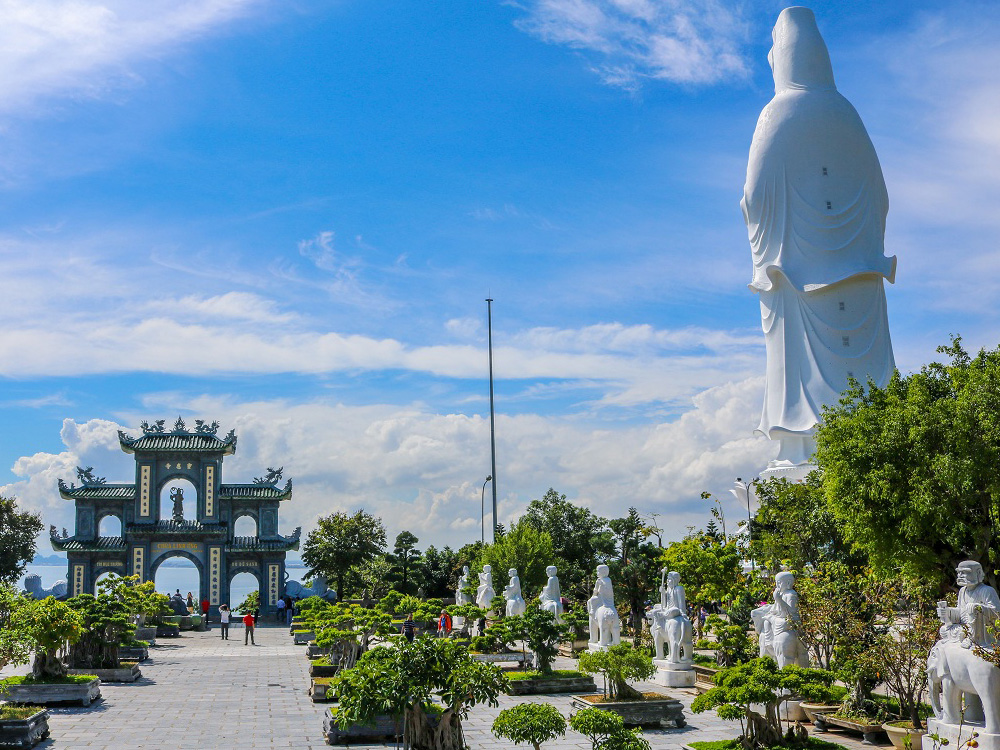 山茶半岛灵应寺 + 白玉观世音菩萨像:灵应寺位于岘港的山茶半岛上,地理位置优越,不管从寺庙哪个 角度眺望,都可以眺望到大海,游客可以上去观赏寺庙的全景以及下面的 18 座罗汉佛像,放眼望去一片 天地大海会聚之美的景象。灵应寺半岛上最著名的要数坐落在南面山腰处的灵应寺,寺中有一座东南亚 较高的白玉观世音菩萨像,高达 65 米。
